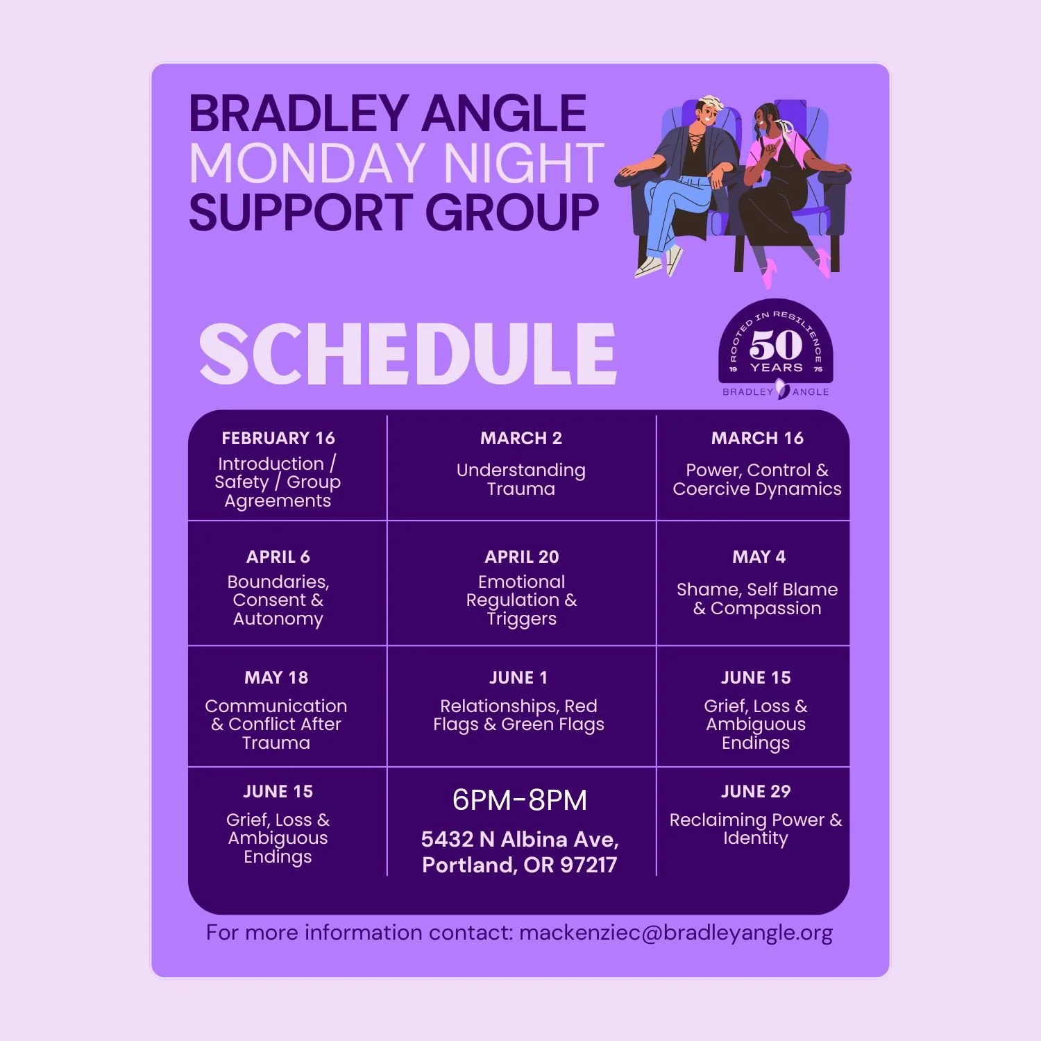 🗓 Mondays | February 16 – June 29 ⏰ 6–8 PM 📍 5432 N Albina Ave, Portland, OR 97217 💜 Free, open to the public, and confidential