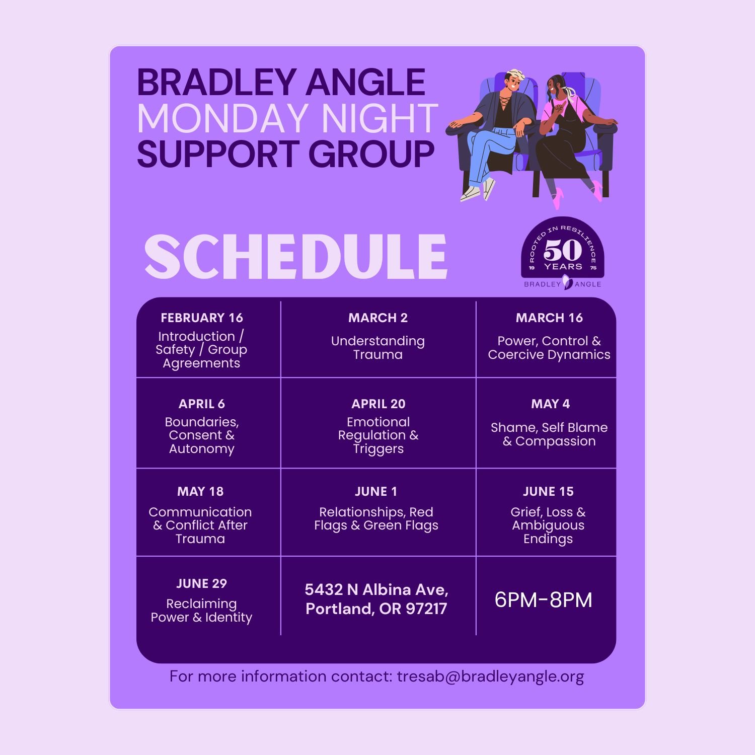 🗓 Mondays | February 16 – June 29 ⏰ 6–8 PM 📍 5432 N Albina Ave, Portland, OR 97217 💜 Free, open to the public, and confidential